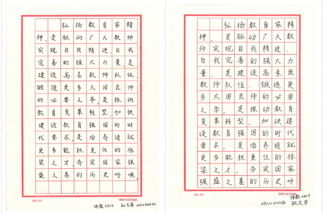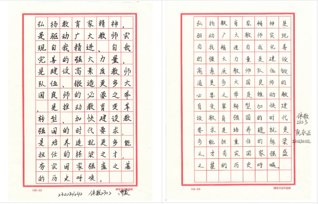 11月20日上午,比赛工作小组组织参赛学生在13-415、420进行钢笔字考察,限时10分抄写了一段指定文本,钢笔字考察的同时进行了一次师德修养教育,进一步强化了师范生教育情怀。