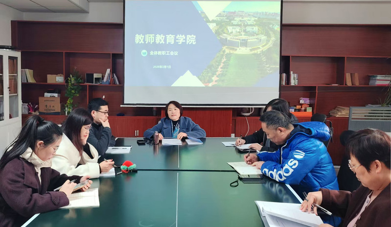 3月1日下午,教师教育学院在鸿远楼210室召开2026年春季学期第一次教职工大会。本次会议主要传达学校有关会议精神,部署学院2026年主要工作,并对开学期间教学及其他工作做出安排。院长郑兆青主持会议。